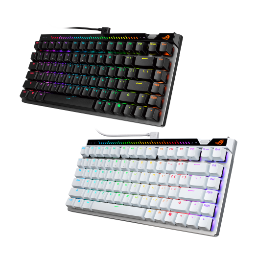 ROG魔导士 Ace HFX 电竞键盘采用 65% 紧凑布局,ROG HFX 电竞磁轴, 快速触发功能, Speed Tap 模式, 互动式触摸面板, 8000 Hz 回报率, 5层吸音棉&类GASKET结构, 双 Type-C 接口, 三种倾斜方式, PC材质上盖