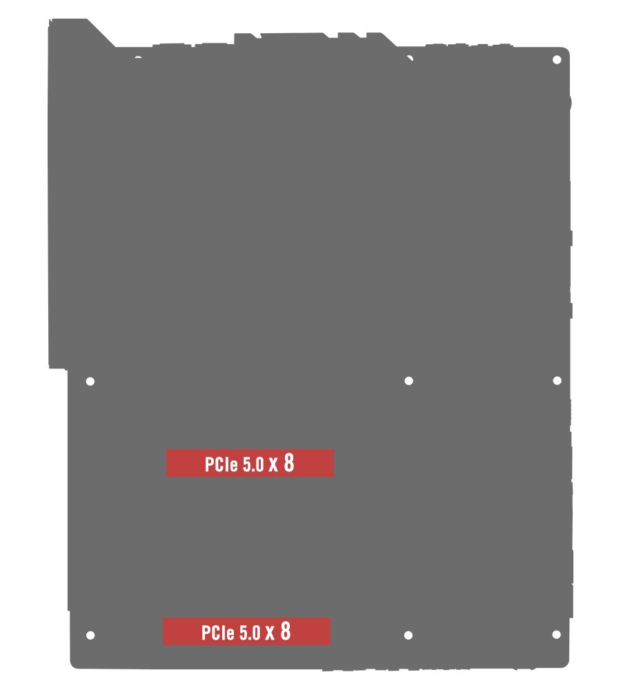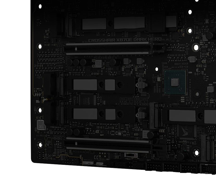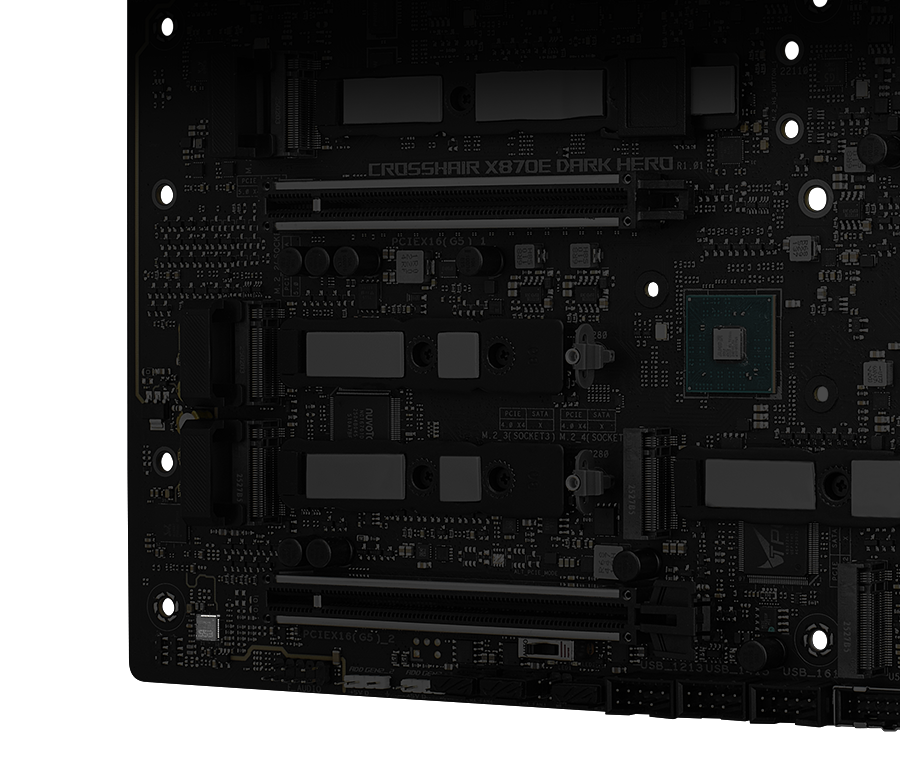 ROG Crosshair X870E Dark Hero 主板还配备两个 PCIe® 5.0 x16 SafeSlot 高强度安全插槽,以支持新一代显卡。 -