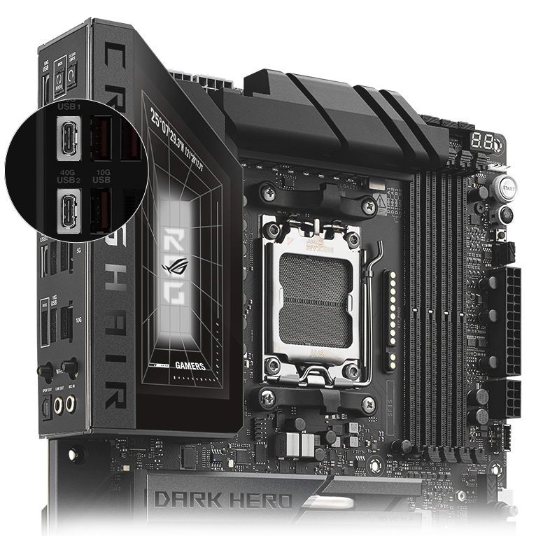 ROG Crosshair X870E Dark Hero 主板提供多达两个 USB4® Type-C® 接口,两个 USB 20Gbps Type-C 前置接口,其中一个支持 Quick Charge 4+ 快充技术(配备 USB Wattage Watcher 最高可达 60W),以及十二个 USB 10Gbps 接口和三个内部 USB 2.0 接针。