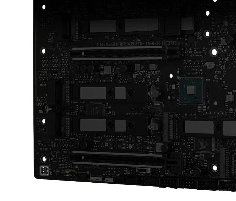 ROG Crosshair X870E Dark Hero 主板配备多达 7 个 M.2 插槽。这包括两个板载 PCIe 5.0 M.2 插槽和一个板载 PCIe 4.0 M.2 插槽;此外还随附一张 ROG Hyper M.2 扩展卡(提供两个 PCIe 5.0 M.2 插槽)以及一个 ROG Q-DIMM.2 扩展卡(提供两个 PCIe 4.0 M.2 插槽)。M.2 插槽还配备强大的散热解决方案,以确保稳定、高性能的运行。