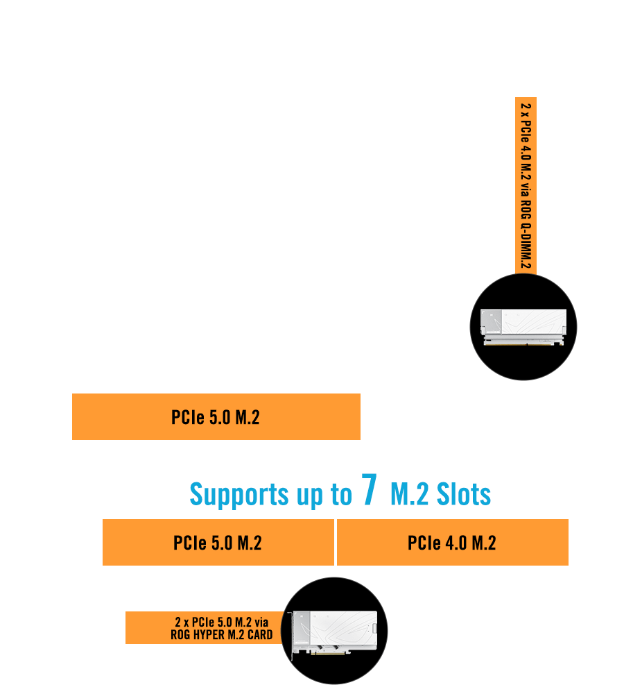 ROG Crosshair X870E Dark Hero 主板配备多达 7 个 M.2 插槽。这包括两个板载 PCIe 5.0 M.2 插槽和一个板载 PCIe 4.0 M.2 插槽;此外还随附一张 ROG Hyper M.2 扩展卡(提供两个 PCIe 5.0 M.2 插槽)以及一个 ROG Q-DIMM.2 扩展卡(提供两个 PCIe 4.0 M.2 插槽)。M.2 插槽还配备强大的散热解决方案,以确保稳定、高性能的运行。